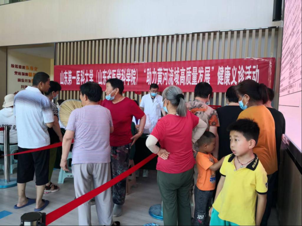下午3点,校(院)第二附属医院的4名内科专家和1名外科专家开始接诊,听说是山东第一医科大学来的专家,群众们纷纷冒着酷暑赶来,其中大部分是老年人,有的老人听力差,说一遍二遍都听不清,专家就反复耐心讲解,义诊持续了二个半小时,各位专家忙的连喝口水的时间都没有。蒲公英红色文化宣传队的志愿者们分工负责维持秩序并进行分诊、为群众检测随机血糖、为群众讲解安全卫生知识和分发宣传材料,内容包括疫情防控、慢性病防治、防诈骗、禁毒知识等。义诊活动共接待群众300多人次,筛查出糖尿病、高血压、冠心病患者50余人,危重症患者2人。此次活动践行了我为群众办实事的宗旨,为沿黄地区群众送去了高质量的医疗服务,丰富了群众的安全和卫生健康知识,为促进黄河流域高质量发展,助力健康中国战略做出了贡献。