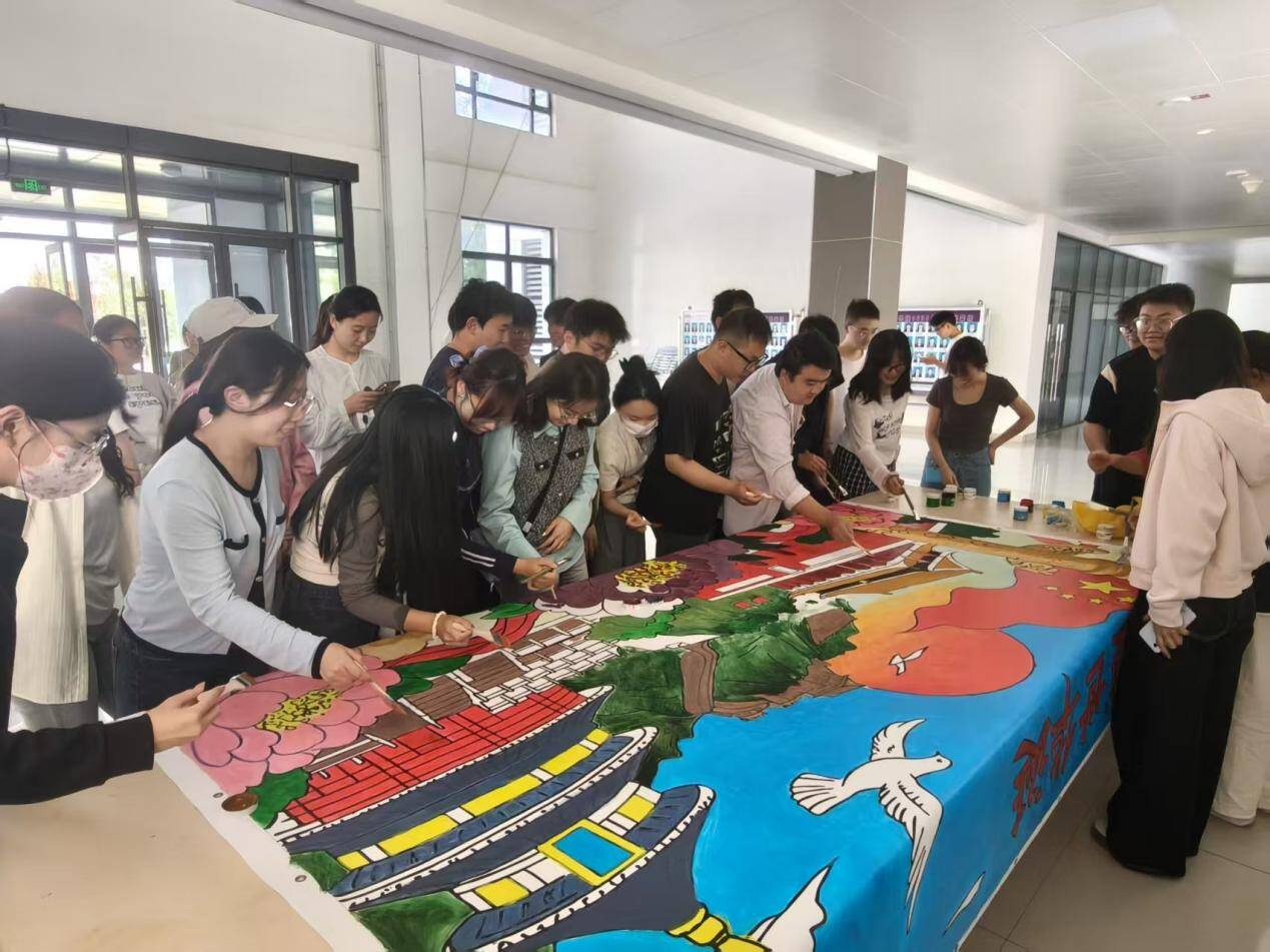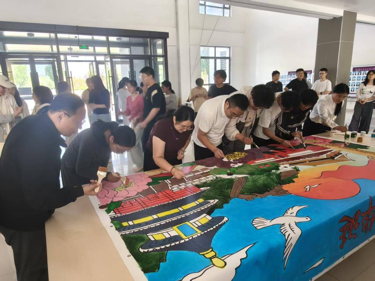 活动现场,师生围绕长卷,以细腻笔触勾勒天安门、和平鸽等元素,用鲜艳色彩描绘长城、天坛等标志性建筑。绘画过程中,大家交流互动、相互配合,空白画布逐渐被填满。在众人的倾力合作下,一幅饱含深情与期盼的画卷顺利完成。这长卷不仅是师生爱国爱党的生动体现,更是绘卷人对祖国未来繁荣昌盛的殷殷期盼。师生围绕作品合影留念,定格这一饱含爱国热忱的时刻。