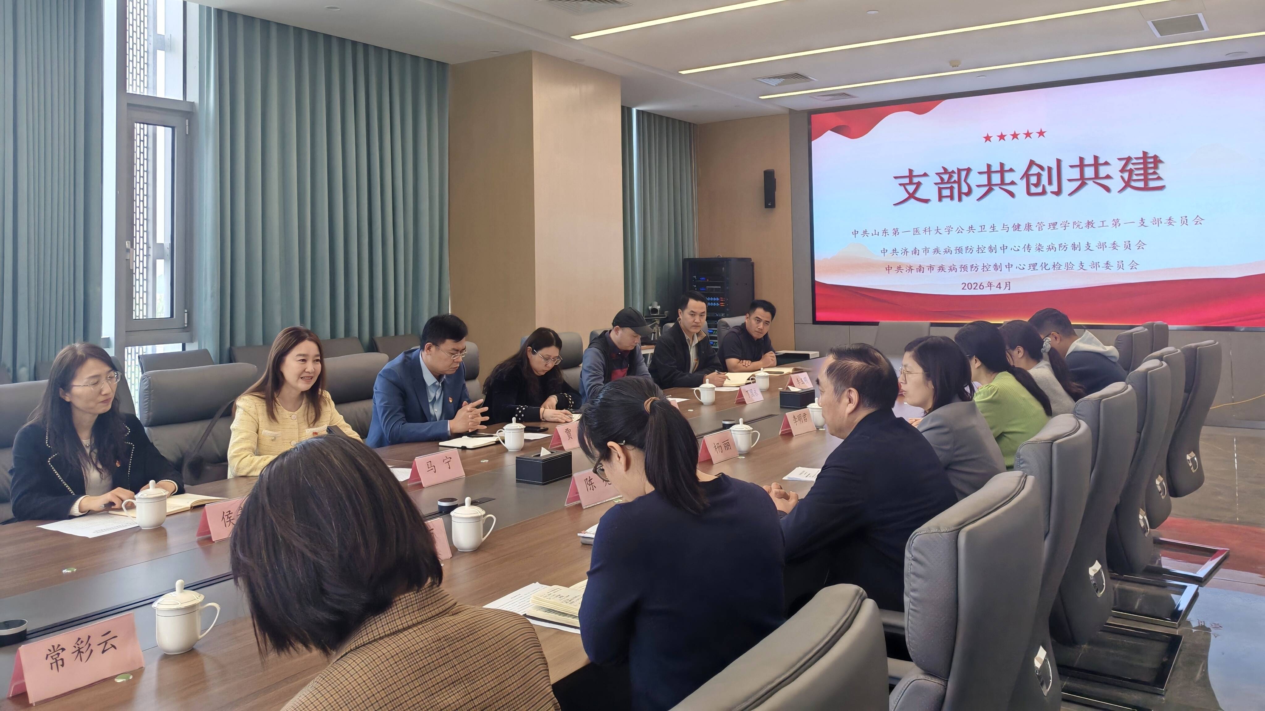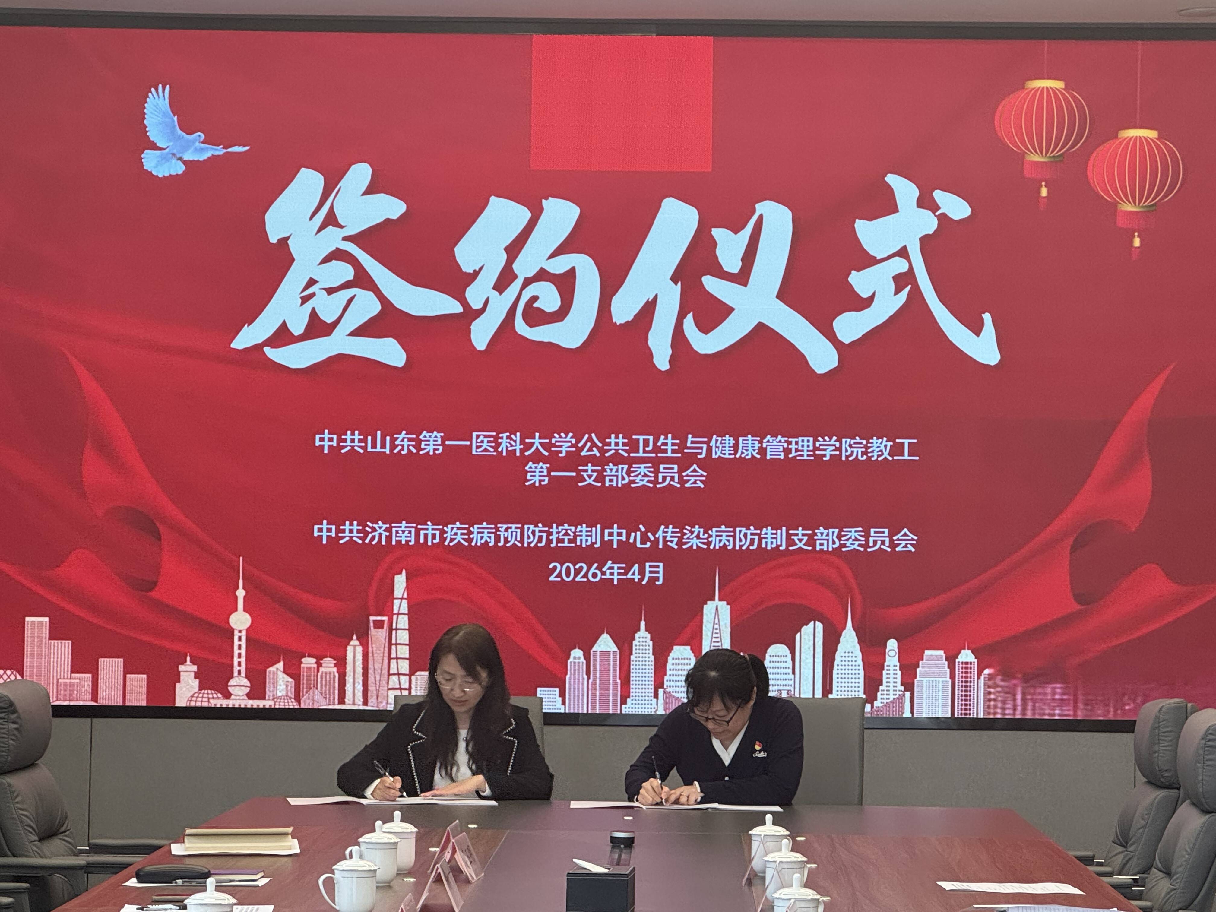 为深入贯彻党的二十届四中全会精神,落实“十五五”规划建议中关于公共卫生体系建设、医防协同融合等决策部署,4月16日,学院教工第一党支部与济南市疾病预防控制中心传染病防制党支部、理化检验党支部举行党建结对共建签约。济南市疾控中心党委书记陈亮,学院党委书记马宁,党委委员、副院长贾强出席活动。