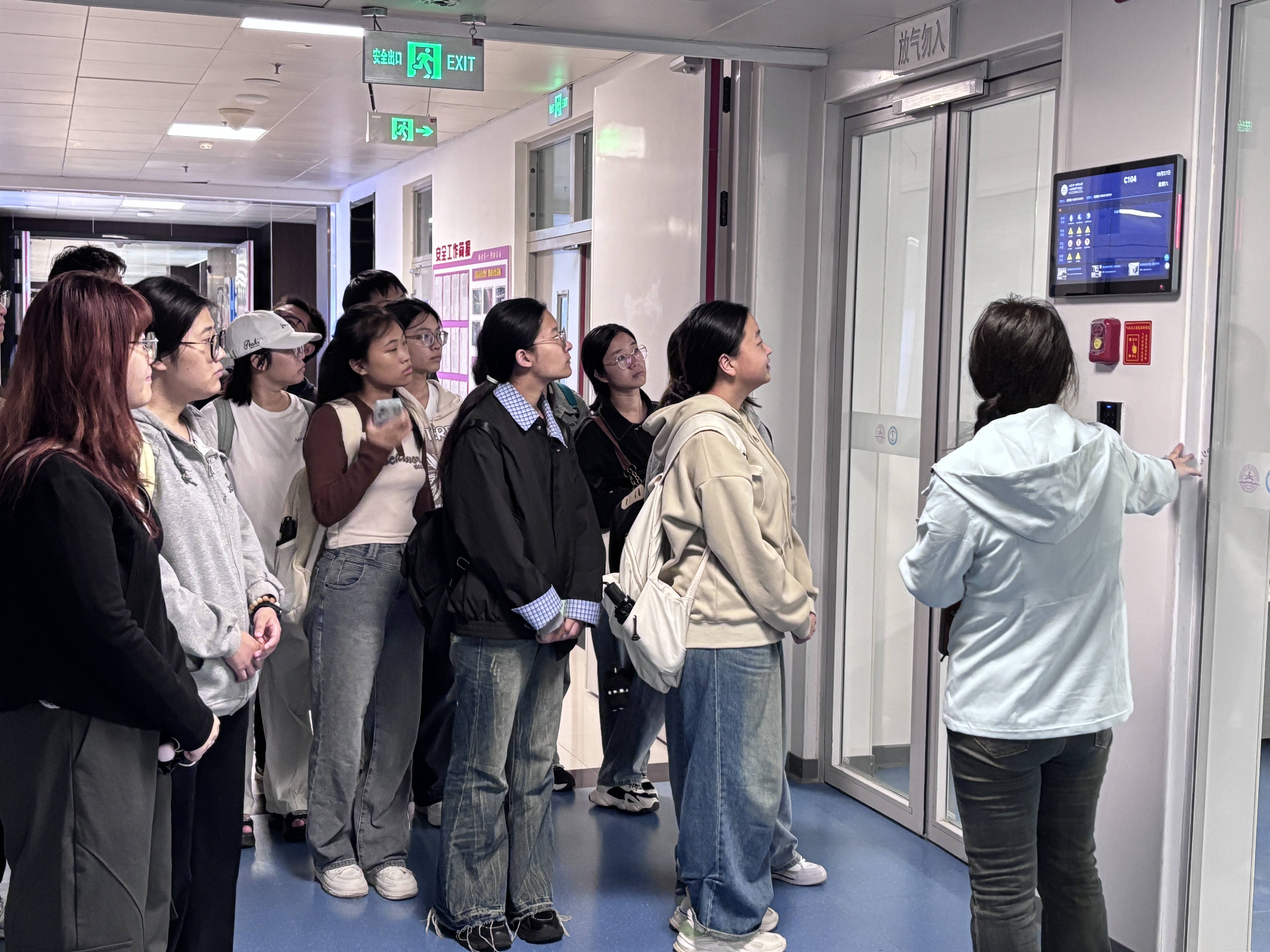 科创中心沈晓彤老师首先介绍了科创中心的整体布局与功能分区,随后带领同学们依次参观了党建活动区、生物样本储存库、大型仪器共享平台等核心区域。在电镜中心,同学们参观了解了包括冷冻电镜、球差校正透射电镜、高分辨扫描电镜等在内的多台世界级显微成像设备。在光学显微成像平台,同学们了解了双光子共聚焦显微镜、超高分辨活细胞成像系统、光片照明显微镜等设备的成像原理与应用场景。 在二楼,同学们参观了PC实验室、医院风采展示区等功能区域,进一步了解了校(院)在科研平台建设、成果转化及医疗服务等方面的综合实力。参观过程中,同学们积极提问,围绕仪器使用、数据分析、科研选题等方面与沈老师展开互动交流。