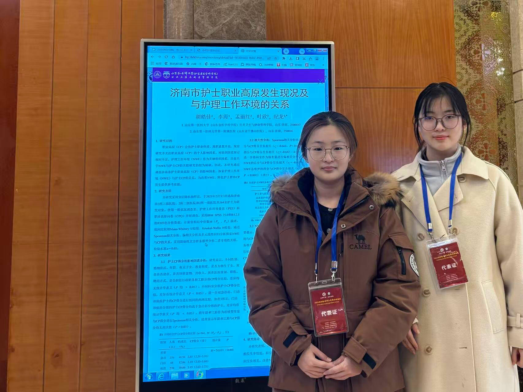 本次会议期间,由公共卫生与健康管理学院纪龙教授,与我校第一附属医院(山东省千佛山医院)孟丽红主任护师、叶欣副主任护师联合指导,2023级卫生检验与检疫专业本科生胡皓佳、李霞完成的研究《济南市护士职业高原发生现况及与护理工作环境的关系》以壁报形式展出。该课题聚焦医疗机构中的护理人员群体,正是公共卫生学科与临床实践紧密结合的生动例证,也是我院推动“公共卫生-临床”交叉培养模式的具体成果。本年度,学院本科生科研项目已三次亮相全国性高水平学术会议,反映出我院在复合型人才培养方面的持续进步。