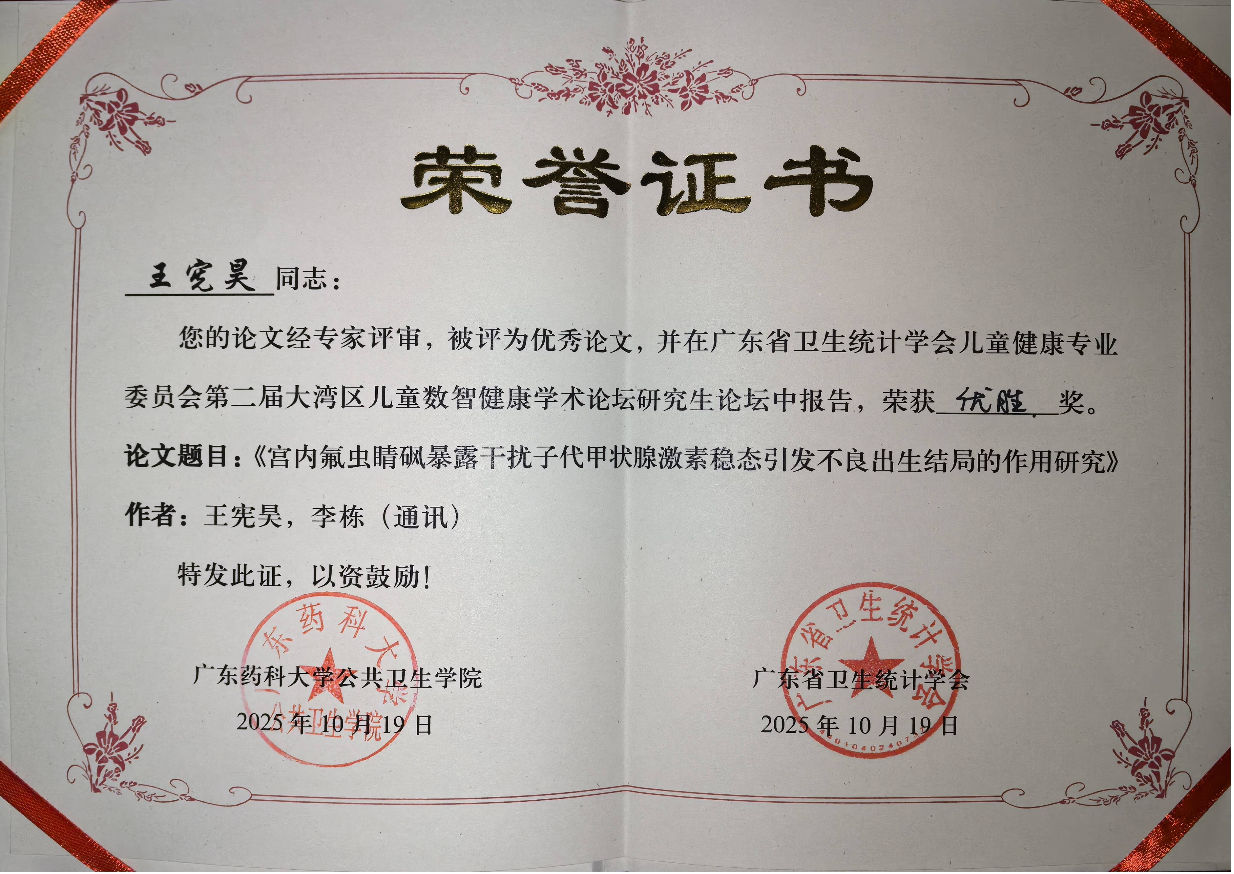 在本次会议中,学院糖基组学与慢性病研究中心2023级流行病与卫生统计学专业硕士研究生王宪昊以《宫内氟虫腈砜暴露干扰子代甲状腺激素稳态引发不良出生结局的作用研究》为题进行口头报告展示。经专家评审,被评为优秀论文,荣获优胜奖。