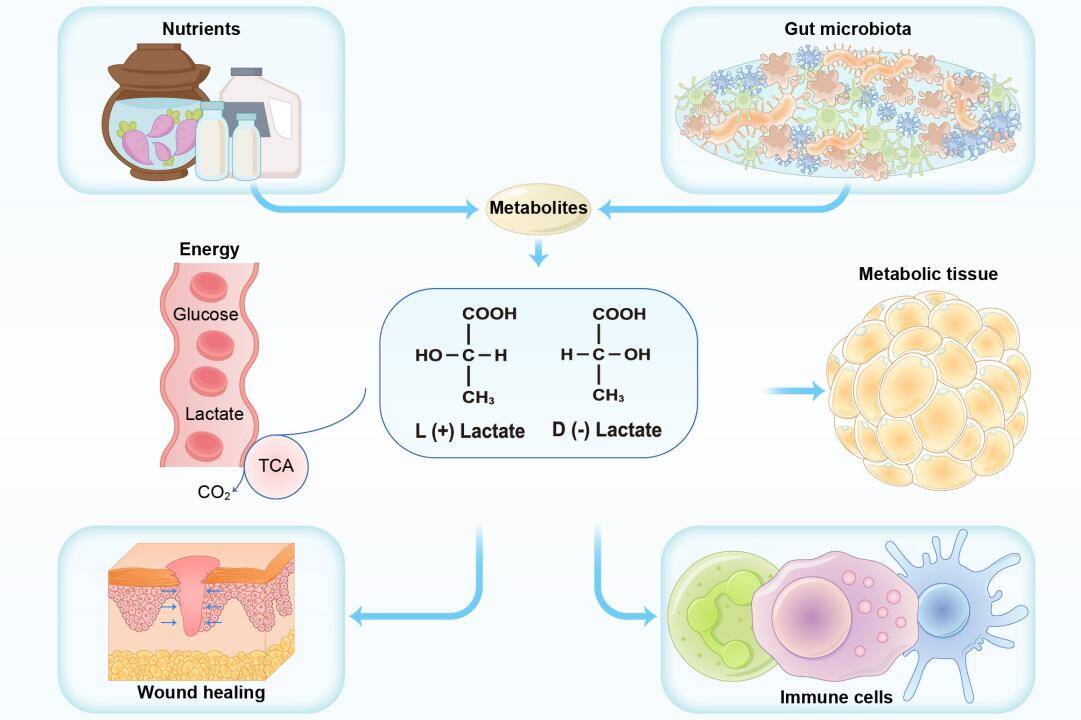 传统发酵食品富含多种有益代谢产物,是人类饮食文化的重要组成部分。近年研究发现,发酵过程中产生的乳酸不仅影响食品风味,还可作为信号分子参与宿主代谢调控。乳酸具有L-和D-两种光学异构体,由不同微生物立体选择性合成,二者生理功能各异。尽管乳酸代谢研究已较深入,其手性差异在营养与疾病调控中的系统作用仍有待阐明。文章指出,发酵食品是D-乳酸的主要膳食来源,而哺乳动物体内主要合成L-乳酸。乳酸的不同构型不仅决定食品风味与品质,还影响其对宿主代谢的调节作用。乳酸通过激活GPR81受体,抑制腺苷酸环化酶,降低cAMP水平,进而调控脂质代谢、糖异生和炎症反应。在功能上,L-乳酸主要参与能量代谢与脑部供能,D-乳酸则在低浓度下表现出信号调控潜力。二者均可经GPR81介导抗炎反应,但作用强度与组织分布存在差异。“乳酸-GPR81”信号轴在代谢性疾病、肠道屏障、免疫调节及神经稳态中具有重要生理意义,为阐释发酵食品的健康效应及开发功能食品提供了理论依据。