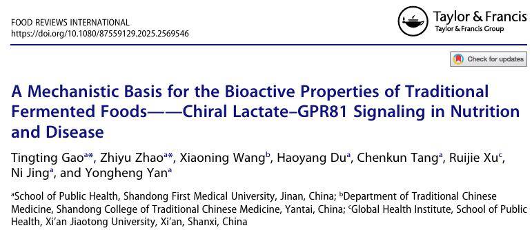 近日,公共卫生与健康管理学院青年教师闫永恒指导的2022级卫生检验与检疫专业本科生高婷婷,在营养与健康领域国际知名期刊《Food Reviews International》(中科院二区,IF=6.0)上,以第一作者身份发表题为“A Mechanistic Basis for the Bioactive Properties of Traditional Fermented Foods——Chiral Lactate–GPR81 Signaling in Nutrition and Disease”的综述论文。 该文系统阐述了发酵食品中乳酸的手性差异(D-型与L-型)及其通过乳酸受体GPR81介导的信号转导途径,揭示了发酵食品在能量代谢、炎症调控及慢性病预防中的潜在机制。