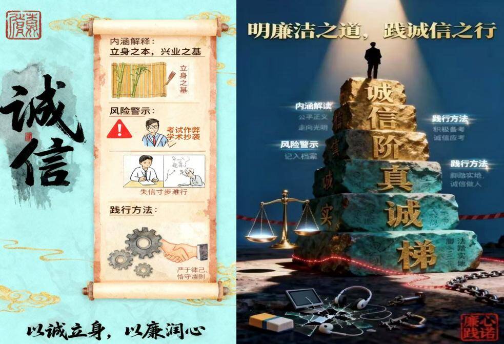 活动以诚信廉洁主题海报征集为核心,学子紧扣校园学习、未来职场场景,聚焦学术诚信、网络诚信、抵制不良校园贷、就业诚信等主题创作作品。部分作品以对比构图揭露失信危害,更有学生结合公卫专业特色,融入职业廉洁、职业诚信元素,彰显学科特色与青年担当。